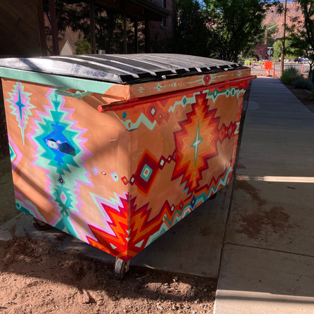 The MARC Dumpster Mural by Peter Apicella (aka PiMo) is located at the Moab Arts building (our building) on 111 East 100 North. It's now painted in a southwest chevron style that brings a little cheer to the block! Come have a look!